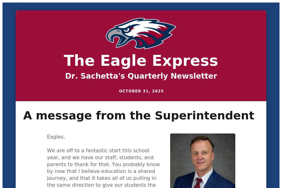 The Eagle Express Dr. Sachetta's Quarterly Newsletter October 31, 2025 A message from the Superintendent Eagles, We are off to a fantastic start this s. . .